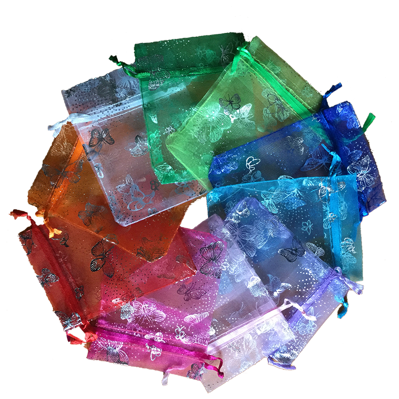 Cada set está compuesto por 10 elegantes bolsitas de organza de varios colores, con motivos de mariposas.